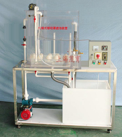 1、移動罩濾池:透明有機(jī)玻璃材質(zhì)、厚度10mm,包含進(jìn)水管、濾層、底部集水區(qū)、出水虹吸管、出水堰口、水位恒定器、沖洗罩、桁車(傳動裝置1套、滑動導(dǎo)軌1副)、濾格、隔墻、排水槽、排水總槽、出水總管、傳動裝置、沖洗泵;