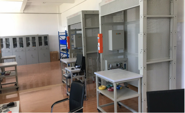 可進(jìn)行電工安裝,如橋架安裝,PVC管安裝,吊燈,白熾燈座,日光燈,開關(guān),插座,控制箱,配電箱等,包含有交流異步電動(dòng)機(jī),直流電動(dòng)機(jī),步進(jìn)電機(jī),伺服電機(jī),溫度控制器,電偶,PLC,變頻器觸摸屏等控制與受控對(duì)象。每個(gè)操作組配套一個(gè)移動(dòng)式工具車和元件柜,便于對(duì)原件的保管和安裝施工,從根本上解決了學(xué)校在普通墻面上進(jìn)行安裝培訓(xùn)的使用不方便,實(shí)訓(xùn)范圍窄的問題。