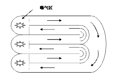 3、配水完成后,對進(jìn)水水質(zhì)進(jìn)行檢測,確定其運(yùn)行參數(shù)并記錄。廢水經(jīng)水泵進(jìn)入氧化溝系統(tǒng)。表面曝氣機(jī)使混合液中溶解氧DO的濃度增加到大約2~3mg/L。在這種充分摻氧的條件下,微生物得到足夠的溶解氧來去除BOD;同時(shí),氨也被氧化成硝酸鹽和亞硝酸鹽,此時(shí),混合液處于有氧狀態(tài)。在曝氣機(jī)下游,水流由曝氣區(qū)的湍流狀態(tài)變成之后的平流狀態(tài),水流維持在最小流速,保證活性污泥處于懸浮狀態(tài)(平均流速>0.3m/s)。微生物的氧化過程消耗了水中溶解氧,直到DO值降為零,混合液呈缺氧狀態(tài)。經(jīng)過缺氧區(qū)的反硝化作用,混合液進(jìn)入有氧區(qū),完成一次循環(huán)。該系統(tǒng)中,BOD降解是一個連續(xù)過程,硝化作用和反硝化作用發(fā)生在同一池中。