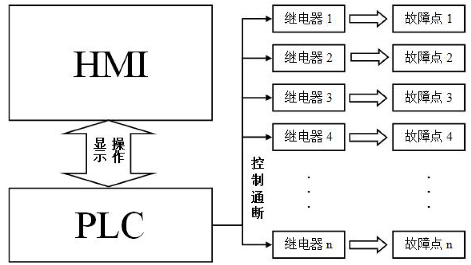 以上述維修電工故障排查考核實訓(xùn)裝置的升級改造為例,本文以其中“CA6140型臥式車床”的考核裝置(原電路有11個故障點)展開闡述。該套方案是將原有考核實訓(xùn)裝置上的操作按鈕升級為HMI組態(tài)棒圖,故障設(shè)置開關(guān)替換為繼電器,并加裝可編程處理器(PLC),實現(xiàn)故障設(shè)置和故障判斷的邏輯控制,組成一套智能電氣控制系統(tǒng),整體如圖2所示。系統(tǒng)同時具備練習(xí)模式和考核模式,其中考核模式具有賬戶管理功能和掉電記錄功能,有更好的操作性和保密性,便于開展故障排查綜合實訓(xùn)和技能鑒定。