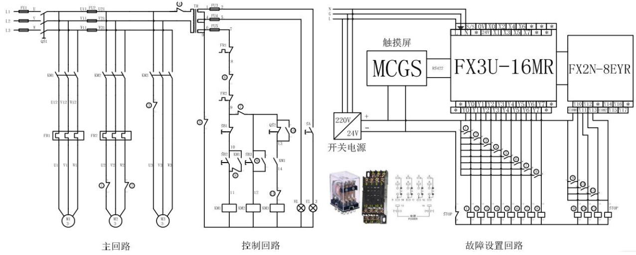 最后增加開關(guān)電源完成觸摸屏和繼電器的供電。而PLC輸入口,可以預(yù)留作為故障碼的設(shè)置,通過檢測繼電器常閉觸點的狀態(tài),檢測繼電器是否符合當(dāng)前的程序控制。