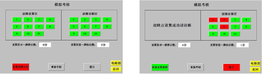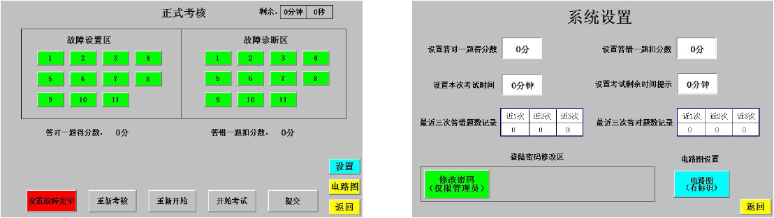 為了應(yīng)對綜合實訓(xùn)與技能鑒定兩種不同場合的實際使用情況,考核模式的操作權(quán)限設(shè)置“教師(考評員)”與“管理員”兩種不同的用戶組,分別對應(yīng)不同的密碼。其中對故障設(shè)置、故障判斷、系統(tǒng)設(shè)置和返回功能的操作權(quán)限對兩個用戶組均開放。其中修改密碼權(quán)限僅對“管理員”用戶組開放,且“管理員”用戶組不僅能修改本組操作密碼,亦能修改“教師”用戶組的密碼,避免教師間修改密碼缺乏溝通或者學(xué)生掌握密碼后隨意修改導(dǎo)致密碼丟失。