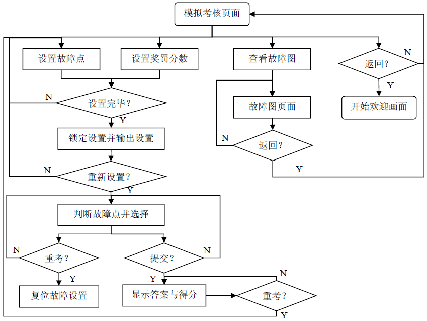 在該模式下,教師/學(xué)生設(shè)置完故障點和獎罰分?jǐn)?shù)(鎖定前可修改),提交后控制系統(tǒng)鎖定設(shè)置并輸出故障信息,如有修改需求可清零設(shè)置。然后交給考試判斷,考生判斷電路后輸入答案(提交前可修改),提交后系統(tǒng)將鎖定選擇,給出分?jǐn)?shù),并提供實際故障點用于與診斷結(jié)果對比。在練習(xí)過程,考生可隨時點開電路圖查看電路。練習(xí)完畢,教師/學(xué)生可復(fù)位重新開始。流程如圖6展示。
