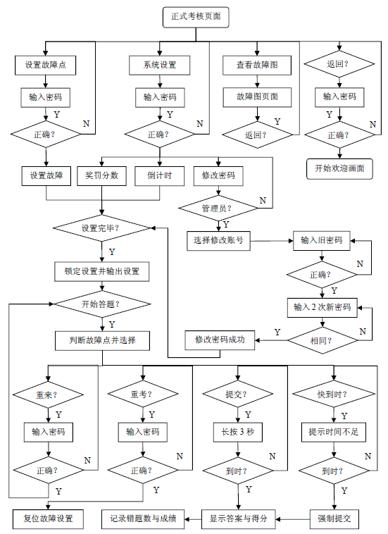 該模式下,只有教師(考評員)/管理員可以登錄,登錄需驗證密碼。部分按鈕的操作亦需要密碼驗證。不同的賬戶登錄,需要驗證不同的密碼。其中管理員賬號還具有修改密碼權(quán)限。其余操作與練習(xí)模式基本一致。流程如圖7展示。