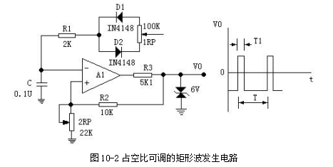 方波電路見圖10-1所示。電路由集成運放與R1、R2及一個滯回比較器和一個充放電回路組成。穩(wěn)壓管和R3的作用是鉗位,將滯回比較器的輸出電壓限制在穩(wěn)壓管的穩(wěn)定電壓值±V2。