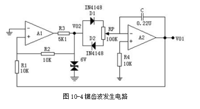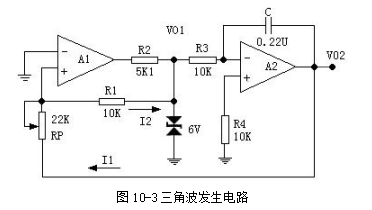 三角波電路如同10-2所示。電路由集成運放A1組成滯回比較器,A2組成積分電路,滯回比較器輸出的矩形波加在積分電路的反相輸入端,而積分電路輸出的三角波又接到滯回比較器的同相輸入端,控制滯回比較器輸出端的狀態(tài)發(fā)生跳變,從而在A2的輸出端得到周期性的三角波。調(diào)節(jié)R1、R2可使幅度達(dá)到規(guī)定值,而調(diào)節(jié)R4可使振蕩滿足要求。