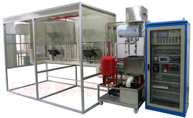 7.生活給水系統(tǒng):主要有給水箱、給水泵、給水管道、壓力變送器、脈沖水表、水龍頭和淋浴頭等組成。管路采用不銹鋼復(fù)合管進(jìn)行設(shè)計(jì),可進(jìn)行不銹鋼復(fù)合管的切割、安裝和通水試驗(yàn)操作,通過控制系統(tǒng)可實(shí)現(xiàn)生活給水系統(tǒng)的變頻恒壓供水功能,實(shí)現(xiàn)單泵變頻控制或雙泵切換控制等功能;通過脈沖式水表可以完成用水量的計(jì)量。