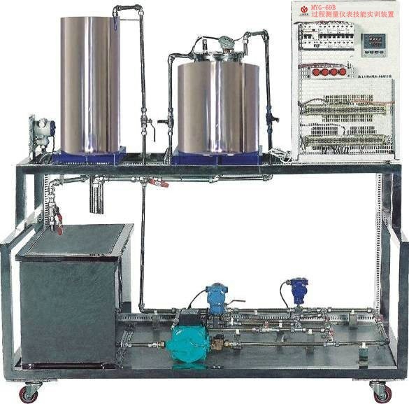 過程測量儀表技能實(shí)訓(xùn)裝置的設(shè)計結(jié)合了目前職業(yè)院!痘y量及儀表》、《過程儀表測量》、《過程檢測儀表》以及《儀表測量工操作實(shí)訓(xùn)》等課程實(shí)驗(yàn)大綱的要求。 由被控對象(不銹鋼框架)和控制系統(tǒng)(網(wǎng)孔板)組成,被控對象包含動力系統(tǒng)、水箱、儲水箱、壓力變送器、差壓變送器、渦輪流量計、P1100、K分度熱電偶、閥門、管路等;控制系統(tǒng)包含網(wǎng)孔板、漏電保護(hù)器、開關(guān)電源、單相調(diào)壓模塊、K分度熱電偶冷端補(bǔ)償器、智能儀表、接線端子排、常用工具及裝置配套件等。通過該實(shí)訓(xùn)裝置的使用和學(xué)習(xí),學(xué)生能夠掌握有關(guān)過程儀表的測量及自動化儀表的安裝、測量及使用。