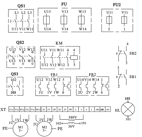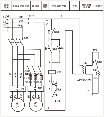 ,接觸器KM的線圈通電而鐵心吸合,主回路中接觸器KM的三個常開觸頭合上,主電機M1得到三相交流電而起動運轉(zhuǎn),同時接觸器KM的常開輔助觸頭也合上,對控制回路進行自鎖,保證起動按鈕SB2松開時,接觸器KM的線圈 仍然通電。若加工時需要冷卻,則撥動開關QS2,讓冷卻泵電動機M2通電運轉(zhuǎn),帶動冷卻泵供應冷卻液。