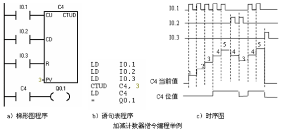 CTUD | Cxxx,PV | 在加計(jì)數(shù)脈沖輸入CU的上升沿,計(jì)數(shù)器的當(dāng)前值加1,在減計(jì)數(shù)脈沖輸入CD的上升沿,計(jì)數(shù)器的當(dāng)前值減1,當(dāng)前值大于等于設(shè)定值PV時(shí),計(jì)數(shù)器位被置位。若復(fù)位輸入R為ON時(shí)或?qū)τ?jì)數(shù)器執(zhí)行復(fù)位指令R時(shí),計(jì)數(shù)器被復(fù)位 |